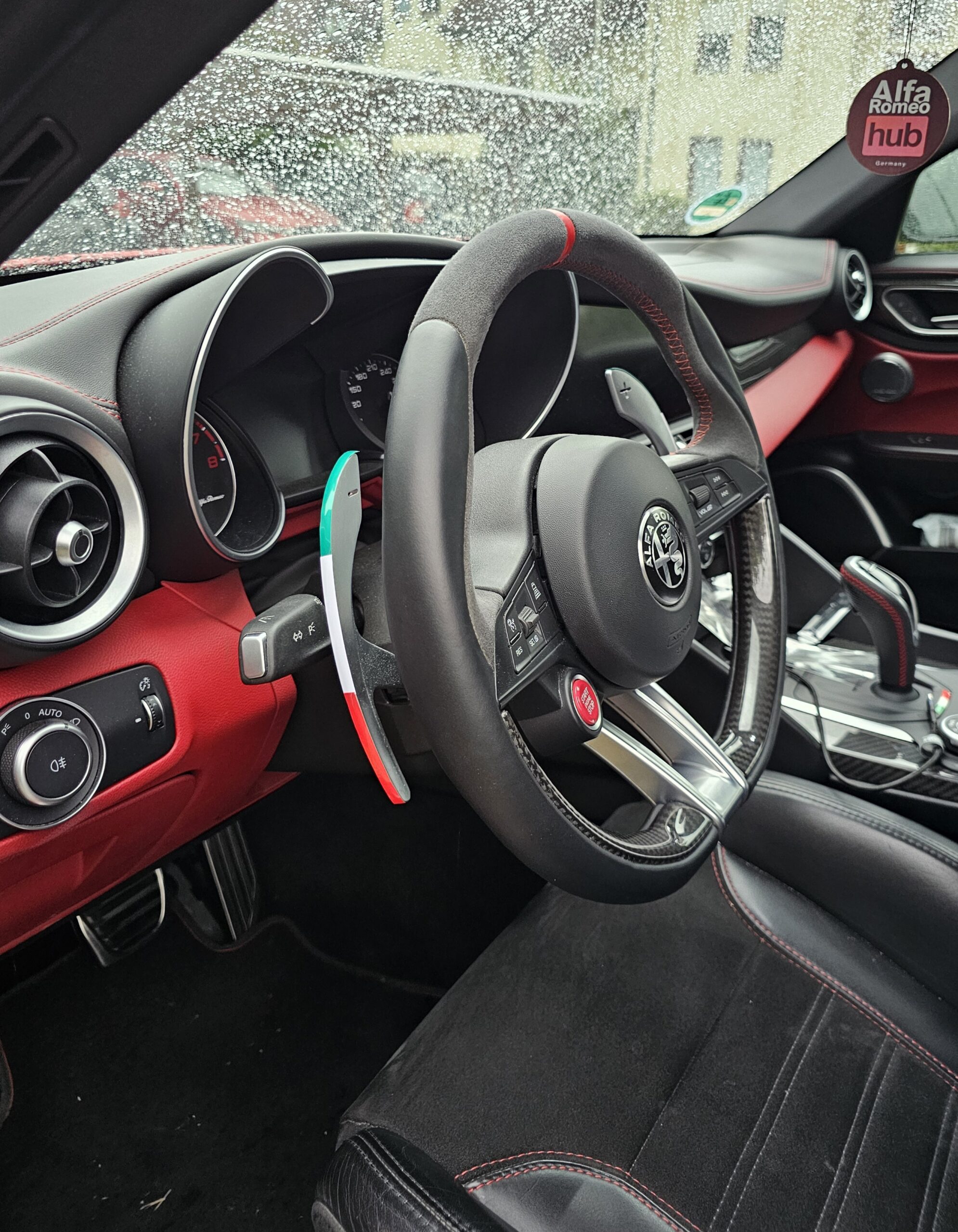 Hochwertige Sticker für die Paddel Shifter der Alfa Romeo Giulia/Stelvio. Präzise geschnitten, optimale Passform und farbintensive Oberfläche. Ideal zum Verfeinern der Schaltpaddel oder als stilvolles Akzent-Upgrade im Innenraum.