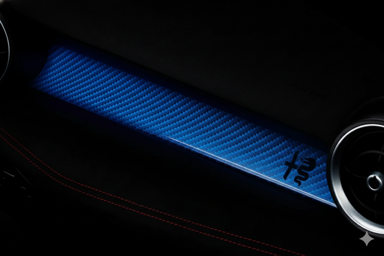 Dieses einzigartige Armaturenbrett-Panel in sportlicher Carbon-Optik ist ein exklusives Design-Element für den Alfa Romeo Tonale. Es integriert eine beeindruckende Ambiente-Beleuchtung, die das ikonische Alfa Romeo Logo und die feine Carbon-Struktur perfekt hervorhebt.