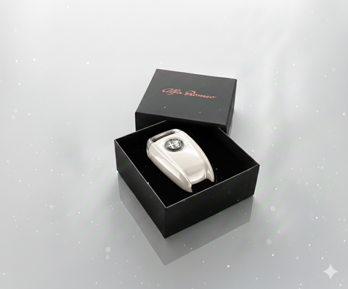 Dieses hochwertige Original Alfa Romeo Schlüssel-Cover in der ikonischen Farbe bianco trofeo schützt Ihren Fahrzeugschlüssel stilvoll und verleiht ihm eine luxuriöse Optik.