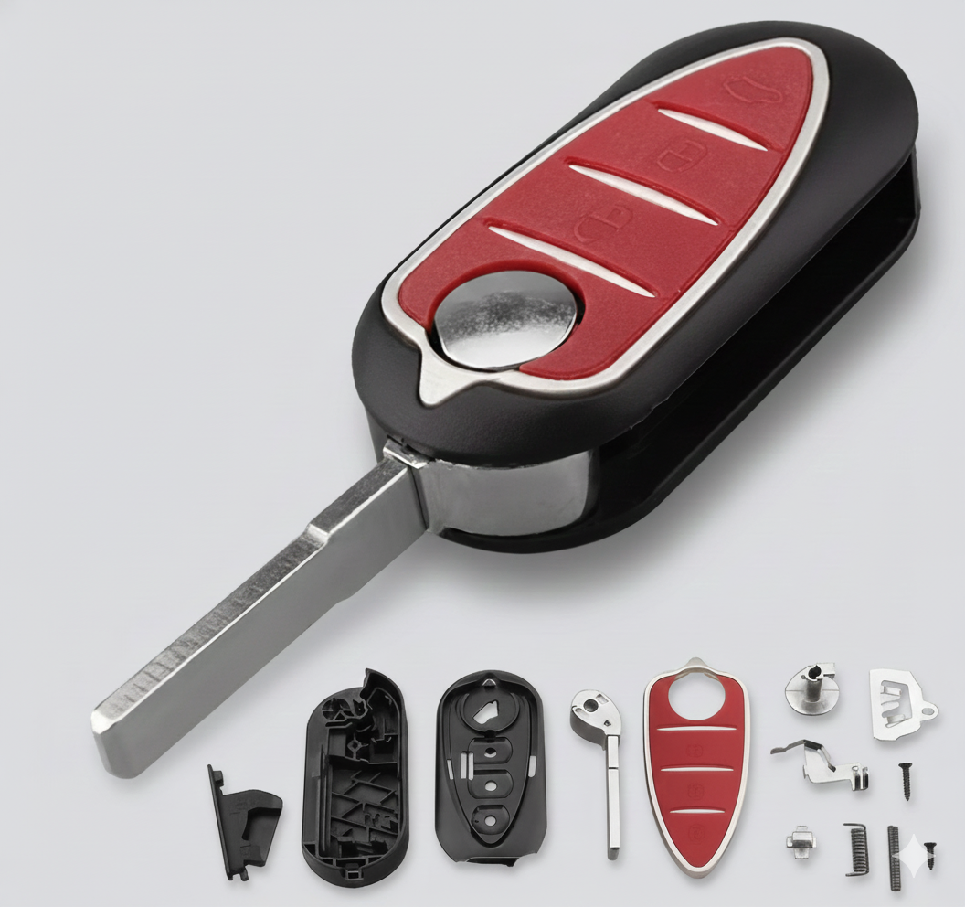 Dieses hochwertige Ersatz-Schlüsselgehäuse im sportlichen Rot-Schwarz-Design ist ideal, um Ihren abgenutzten oder beschädigten Alfa Romeo Klappschlüssel zu erneuern.